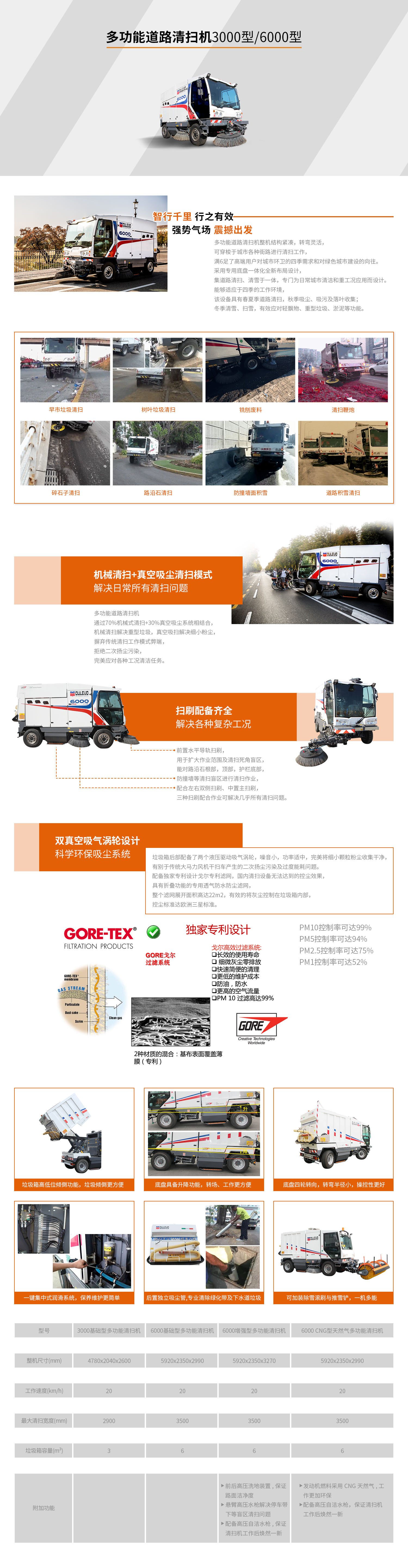 适应于四季的工作环境,具有春夏季道路清扫,秋季吸尘、吸污及落叶收集,冬季清雪、扫雪,轻飘物,重型垃圾、淤泥等功能