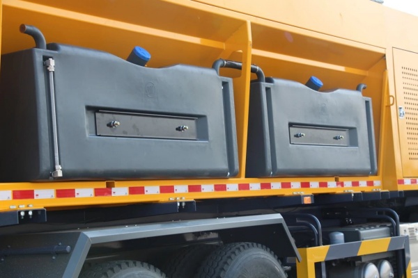 该撒布机还可选装预湿撒布功能,预湿水箱布置在箱体两侧,共计3.2m³,预湿撒布的好处是可以加快固体融雪剂的作用时间,进而减少融雪剂的使用量。
