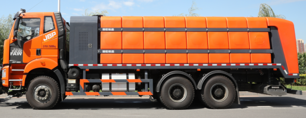 该车型之所以能够四季通用,不得不提到的就是其水罐系统的设计。水罐采用模块化设计,片式水箱,串联结构;单片水箱容量为2m³;水罐材质采用聚乙烯,耐低温,防腐蚀,既可以加装水亦可以加装液体融雪剂。